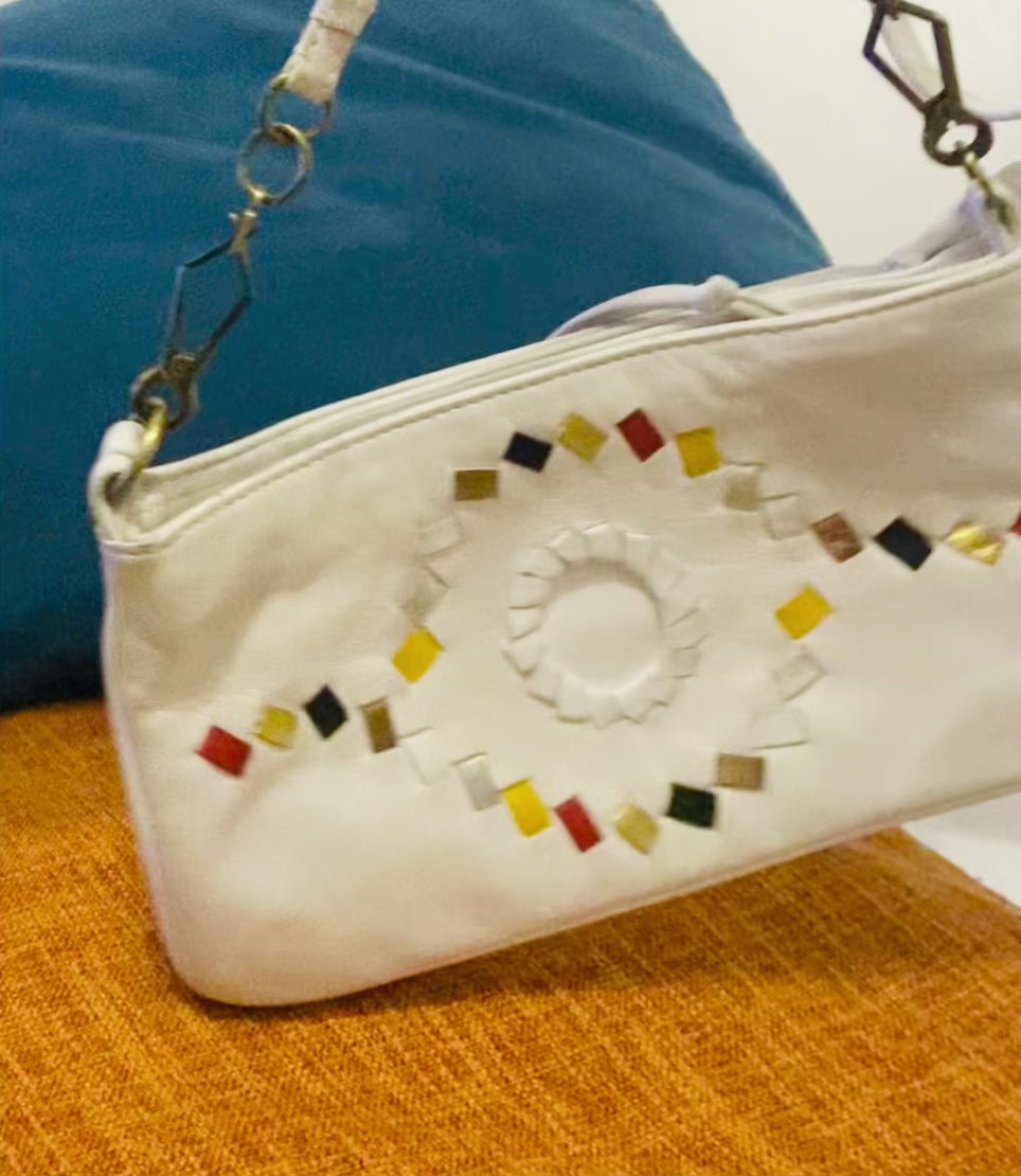 A remarkable Bottega Veneta shoulder bag from the late 1970s, this piece represents a defining moment in Italian craftsmanship — a time when Bottega Veneta was evolving from a discreet artisanal atelier in Vicenza into one of the most refined names in luxury leatherwork. Before the intrecciato weave became the brand’s enduring signature in the 1980s, Bottega’s artisans experimented with pattern, texture, and structure. This rare example captures that transitional era of creativity: a supple ivory nappa leather base interlaced with handwoven strips of metallic, sapphire, and crimson leather, creating a vivid geometric composition that feels both modernist and sensual. The rhythmic geometry of the design reveals the spirit of the late 1970s — an era when Italian design houses embraced bolder visual codes and architectural precision. The minimal hardware and clean silhouette reflect Bottega Veneta’s early philosophy of “when your own initials are enough” — a celebration of craftsmanship over logos.
